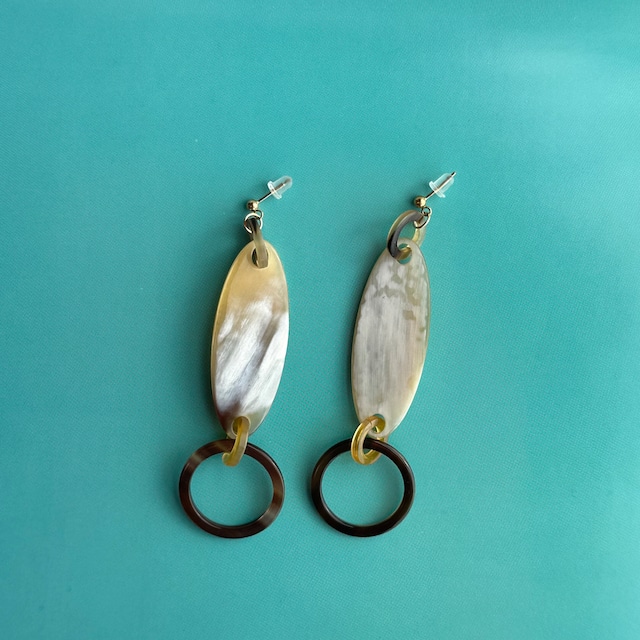 全て柄の違うバッファローホーン(水牛)の リングパーツが揺れるピアス(イヤリング) 柄が違うことで印象が全く変わるので 1点物で製作しているアイテムです 好評の声に応えて期間限定ながら オンラインショップで販売いたします 大きいのに凄く軽く、着け心地も楽に着けてもらえます。 バッファローホーンの色が1色で構成されていないので コーディネートもしやすく、季節も選ばずに着けてもらえます。 ポップアップショプでも人気のデザインです。 日常の時間から特別な時間まで、 いつでも着けて頂けるピアス(イヤリング)です。 Kazaru-Kazaruのアクセサリーは お買い上げ頂いて1年間お修理無料です。 素材 バッファローホーン(水牛の角) 金属部分は全て14金ゴールドフィルド 【14金ゴールドフィルドについて】 真鍮の地金に14金を熱と圧力で張り付けた素材です メッキのアクセサリーよりも、 色が薄くなったり黒くなったりしにくく、 表面が14金そのものなので 痒くなったり痛くなったりもしにくいアレルギーにも強い素材です 基本的に14金のアクセサリーが着けられる方は大丈夫ですが、 アレルギー反応が出た際はすぐに外して頂き、 医師と相談して下さい 自分が作ったアクセサリーが 大事にされないのは悲しいので 14金ゴールドフィルドの素材を使っています ピアス/フックタイプ こちらのピアスはイヤリングに交換出来ます サイズ 全長 約9.5cm 生産国 日本 1点物の商品に付き、在庫をご準備できない場合がございます。 品切れの際は申し訳ありませんが、ご了承ください。 ご覧のブラウザ・PCの環境で 実際の色とは異なる場合があります。 天然素材のため、色・形・大きさ 柄や色の出方・バランスが異なる場合があります 使用している天然石や淡水パールには天然資材の為、 多少のカケやクラック等が見られる粒もございます ご了承の上お買い求め下さい