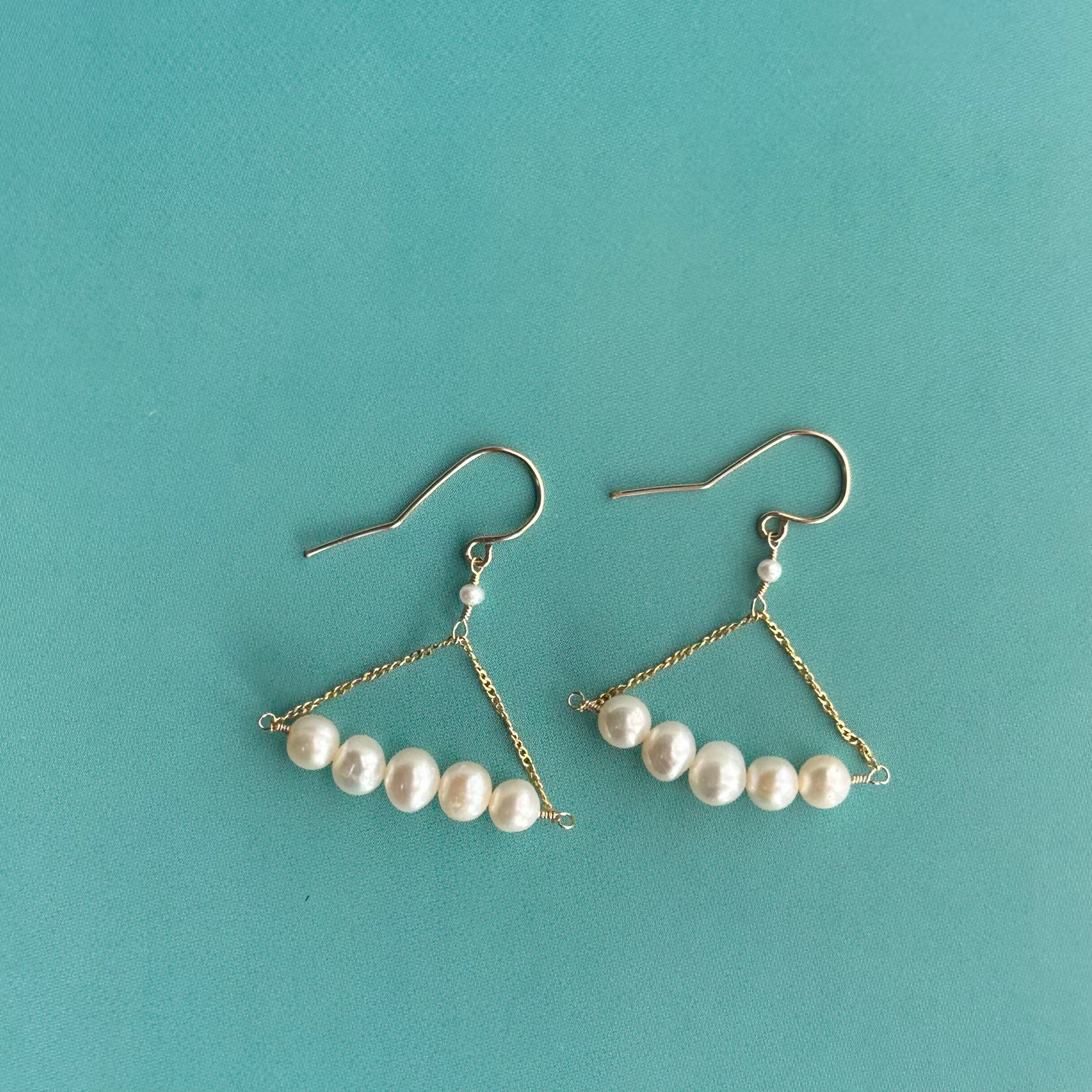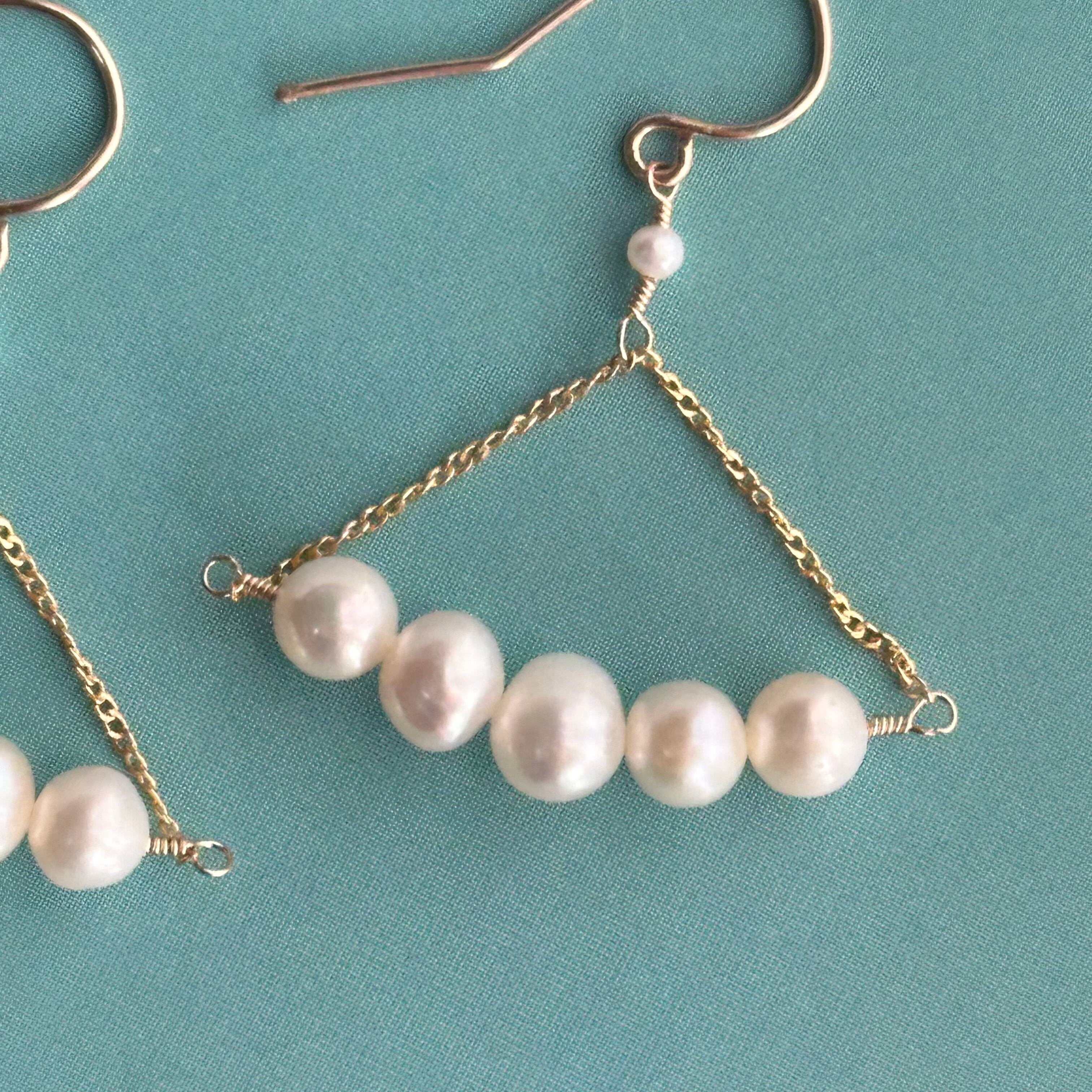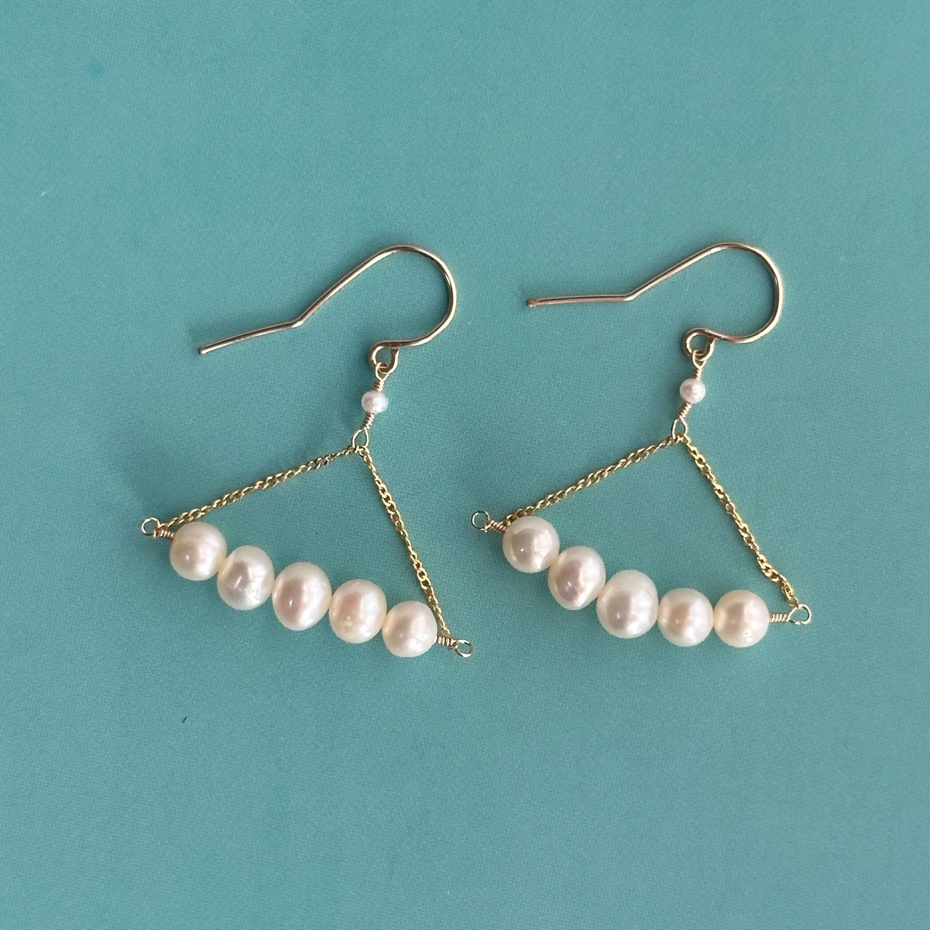 淡水パールを横に並べて配置し、シルエットが少し横に長いピアス(イヤリング)。