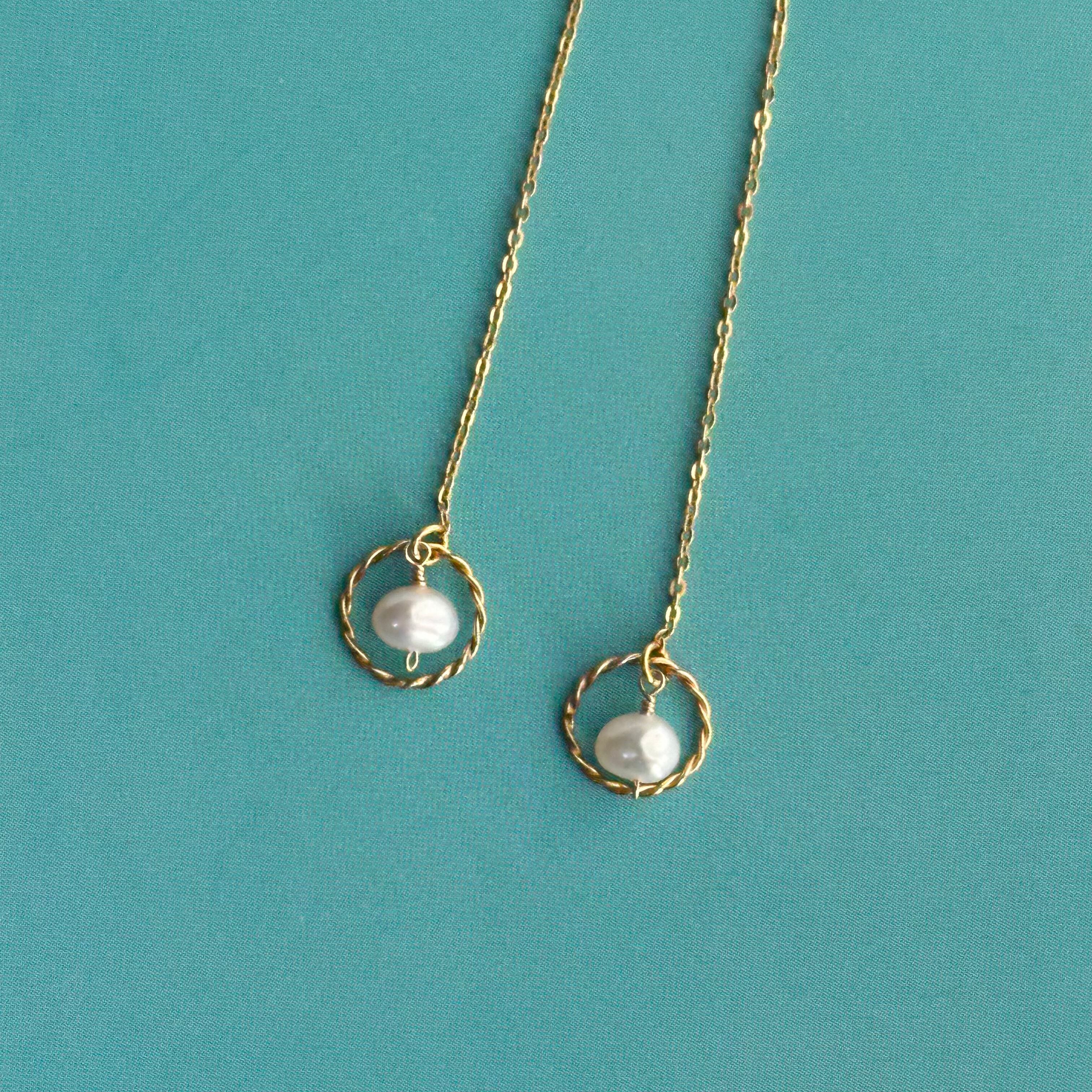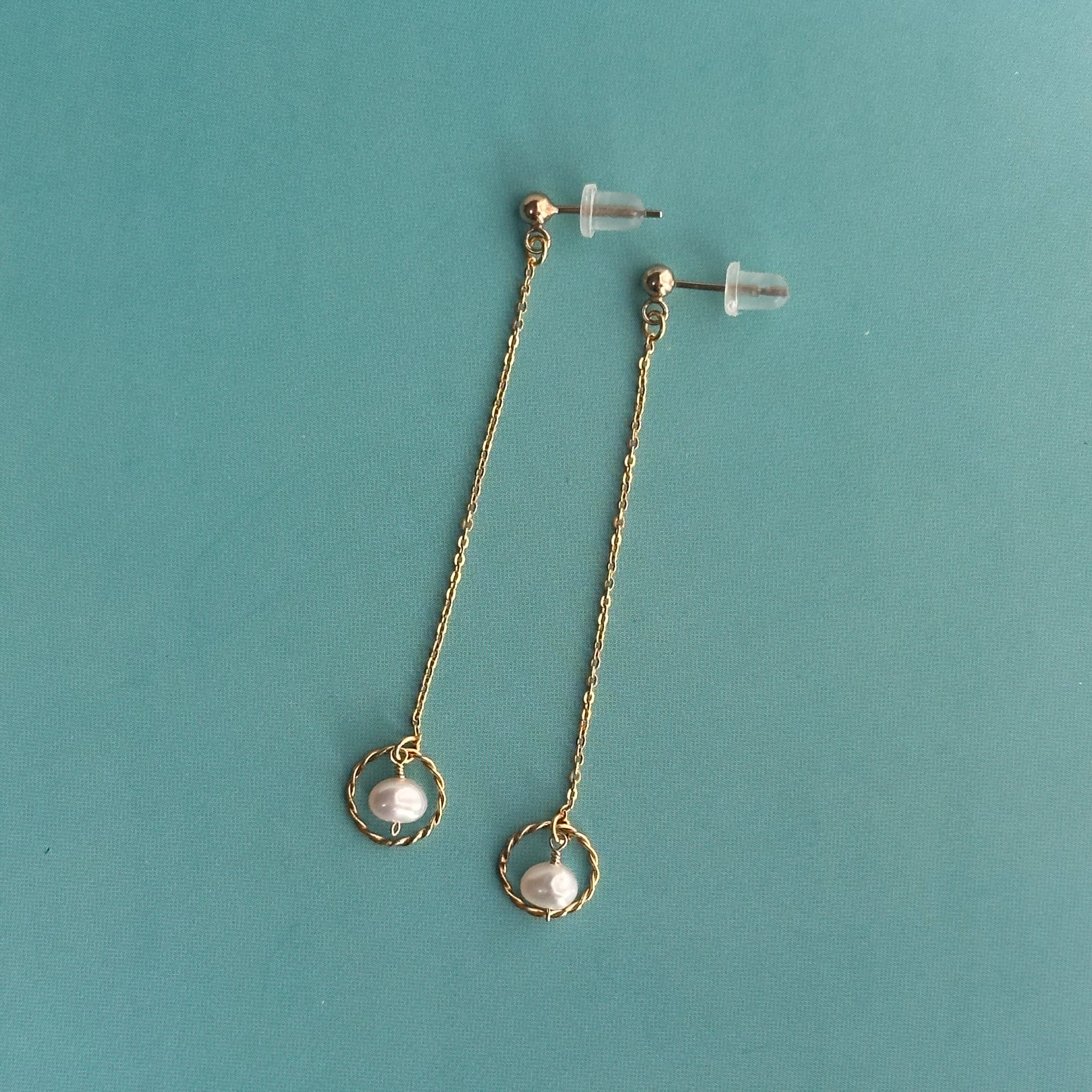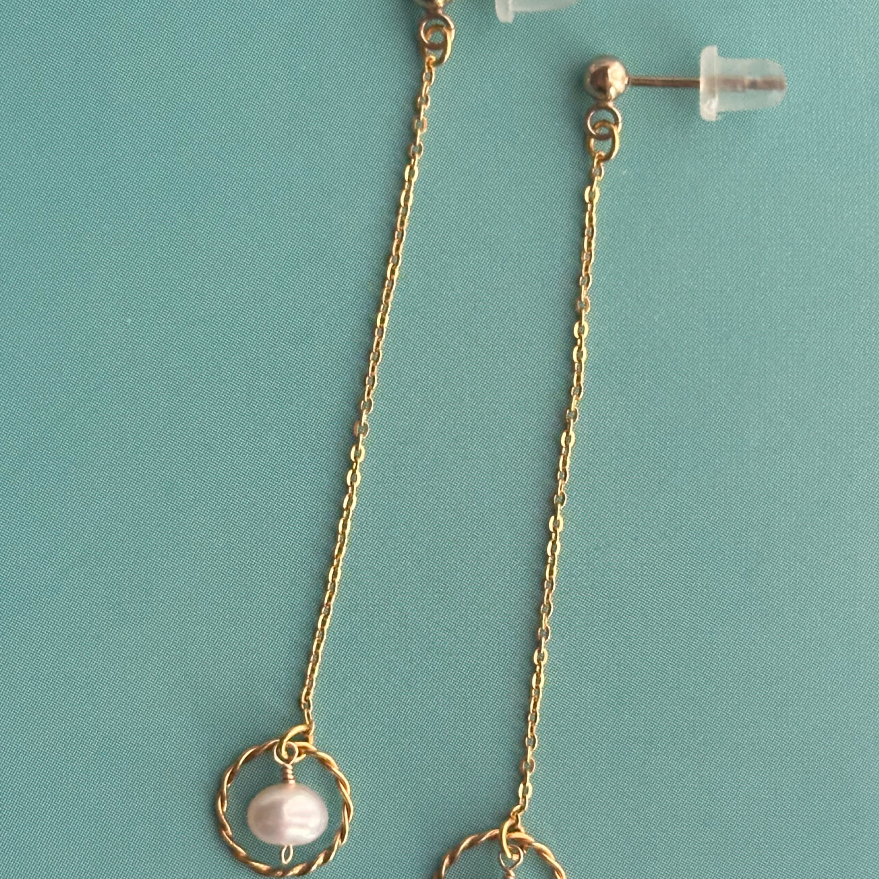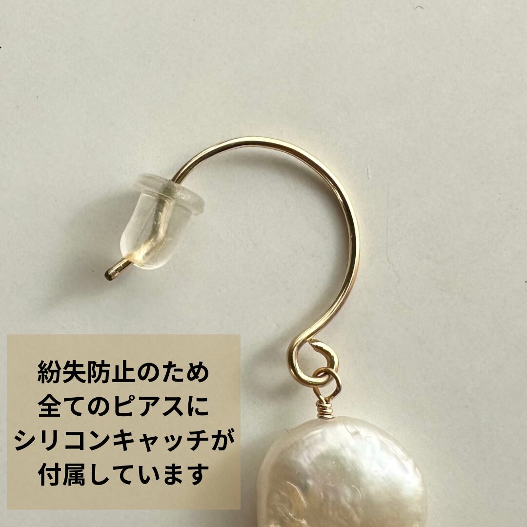 動く度にリングパーツとポテト型の淡水パールが揺れるポストピアス(イヤリング)。