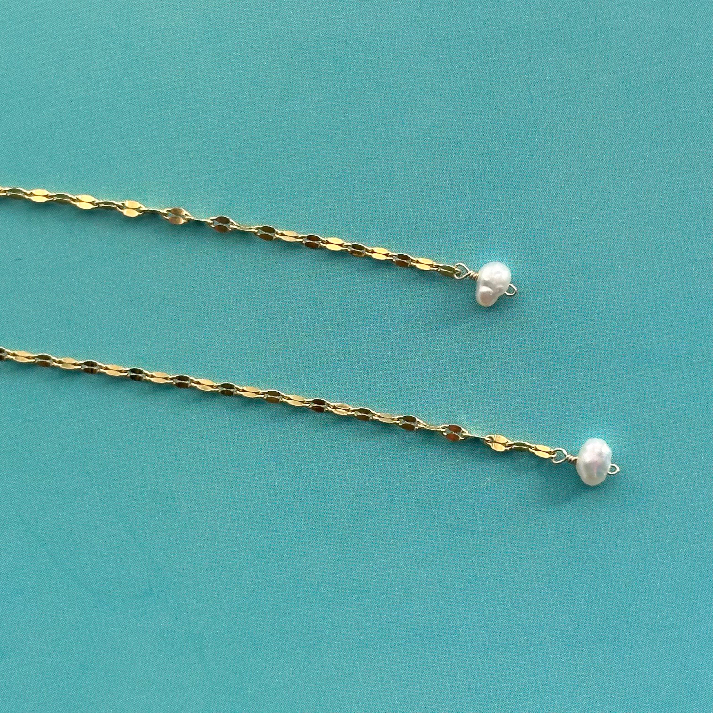 つぶした部分がクローバーの様な形で印象的なチェーンと淡水パールを組み合わせたピアス(イヤリング)